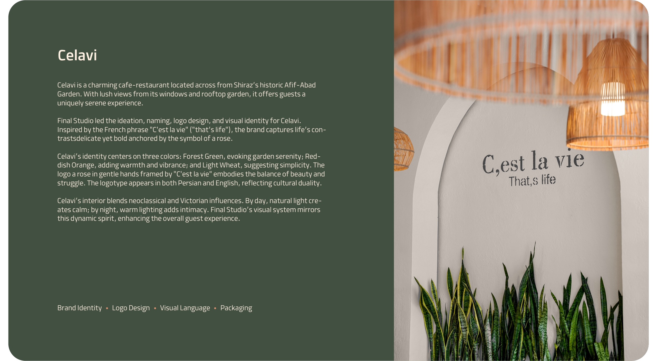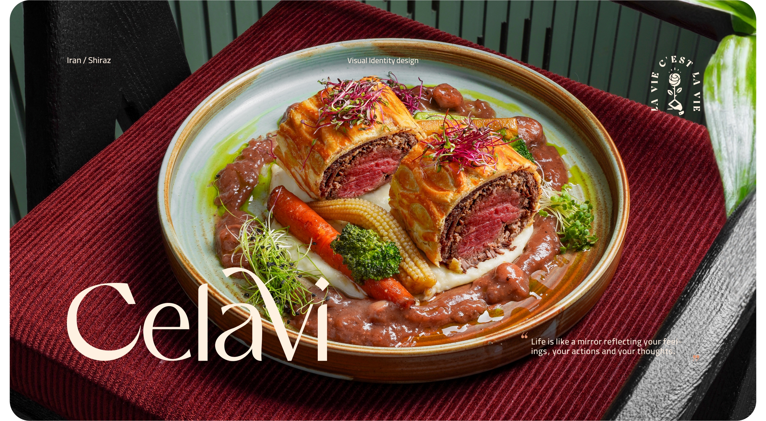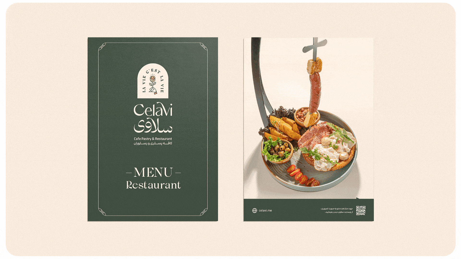 Celavi, a charming café-restaurant across from Afif-Abad Garden in Shiraz, features a neoclassical and Victorian ambiance. Final Studio, inspired by “C’est la vie” meaning “that’s life,” crafted its visual identity with Forest Green, Reddish Orange, and Light Wheat tones. The logo, with a rose and the phrase “C’est la vie,” reflects the balance between life’s tenderness and challenges. Final Studio brought this essence to life across all of Celavi’s visual elements.